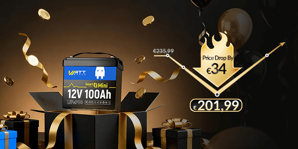 Smart Version der Mini-Batterie: WattCycle 12V 100Ah LiFePO4 Mini Smart Batterie hat die gleichen ultrakompakte Abmessungen (L229 x B138 x H208 mm) und das geringe Gewicht (9,50 kg) wie Mini Batterie bei einer untrahoher Energiedichte von 134,74Wh/kg.